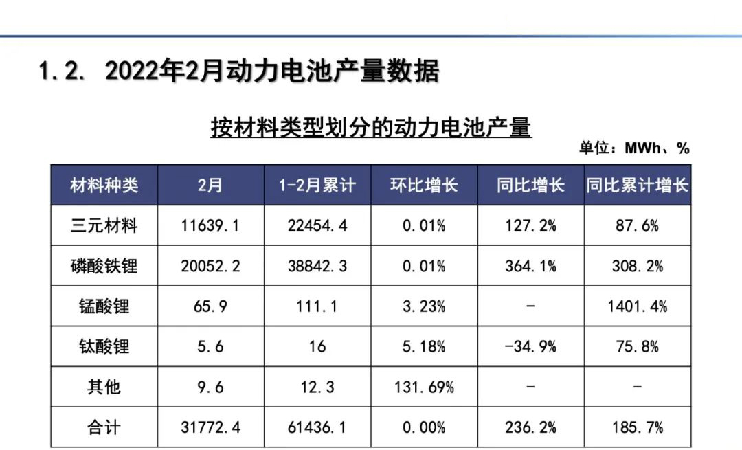 产量方面:2022年2月,我国动力电池产量共计31.8GWh,同比增长236.2%,环比增长0.0%。其中三元电池产量11.6GWh,占总产量36.6%,同比增长127.2%,环比增长0.0%;磷酸铁锂电池...