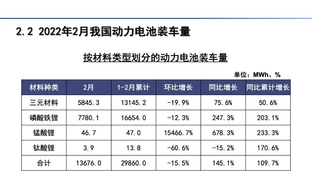 装车量方面:2022年2月,我国动力电池装车量13.7GWh,同比上升145.1%,环比下降15.5%,同比继续保持大幅增长。其中三元电池共计装车5.8GWh,同比上升75.6%%,环比下降19.9%;磷酸铁锂电池共计装车7.8GWh,同比上升247.3%,环比下降12.3%。1-2月,我国动力电池装车量累计29.9GWh,同比累计增长109.7%。其中三元电池装车量累计13.1GWh,占总装车量43.8%,同比累计增长50.6%;磷酸铁锂电池装车量累计16.7GWh,占总装车量55.9%,同比累计增长203.1%,呈现快速增长发展势头。